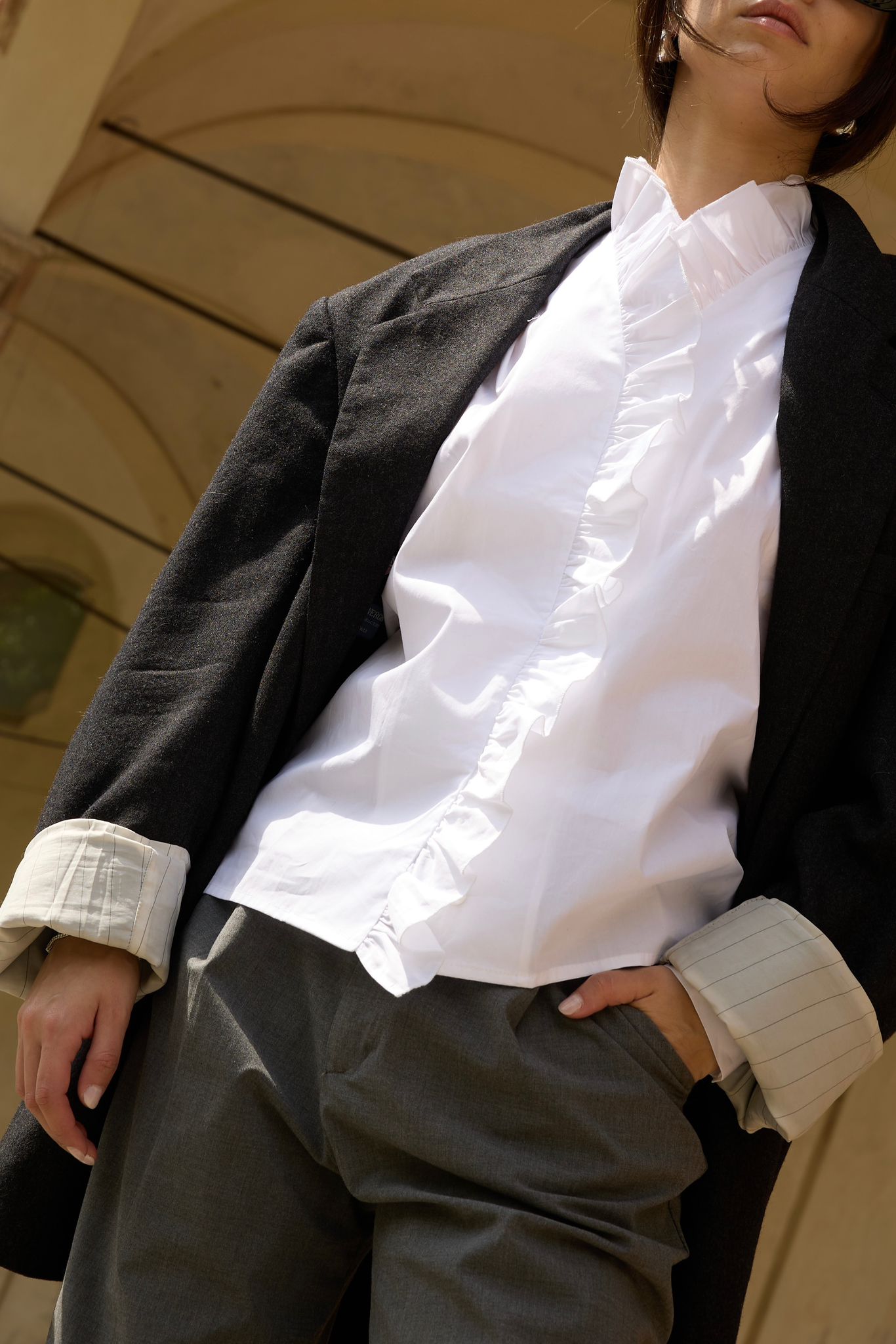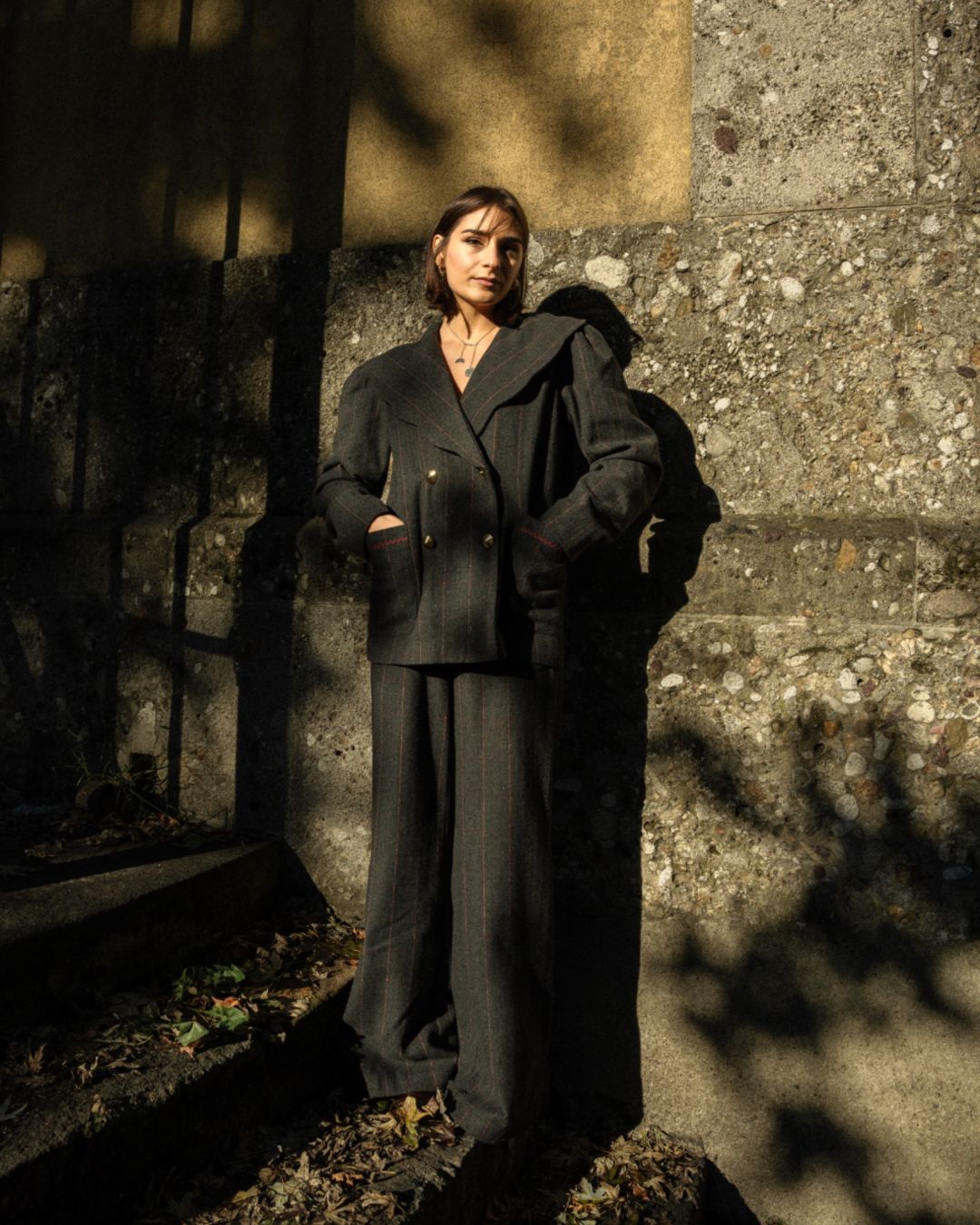 Tailleur gessato, spalla morbida.
