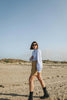Righe bastoncino azzurre, manica balloon importante e colletto alla coreana: entri in ufficio in sneakers, esci a cena con un tacco e lei è sempre perfetta.